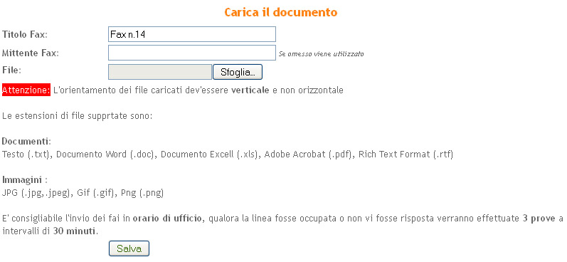 Dopo avere cliccato su “Crea Fax” si seleziona la Lingua e si accede alla schermata di caricamento:
