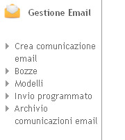 Cliccando sul link Gestione Email compare l’elenco di tutte le funzionalità di questa sezione, ovvero: