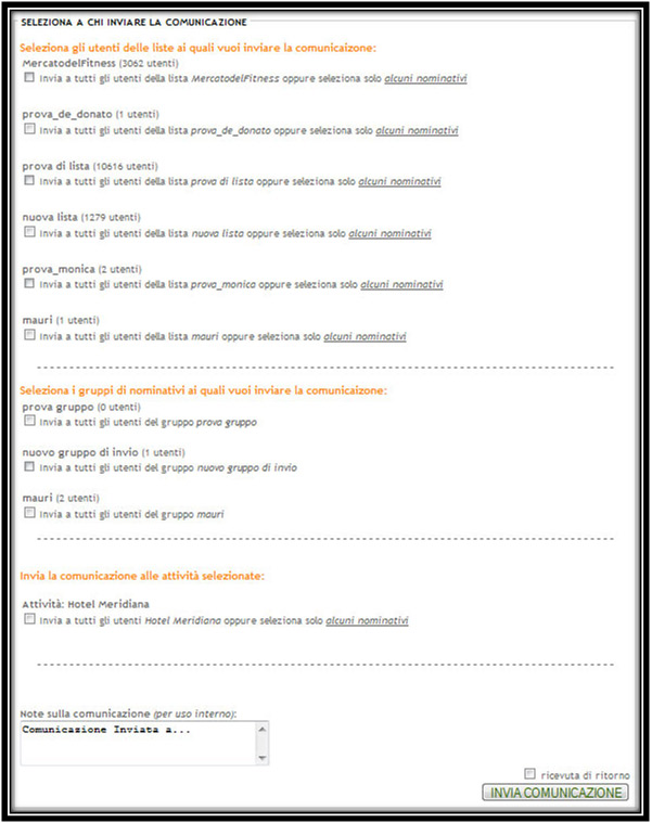 Effettuando una selezione di una o più voci di profilazione la comunicazione non verrà più inviata a tutti i nominativi di tutta quell’attività ma solo al target definito dalla nostra selezione.
